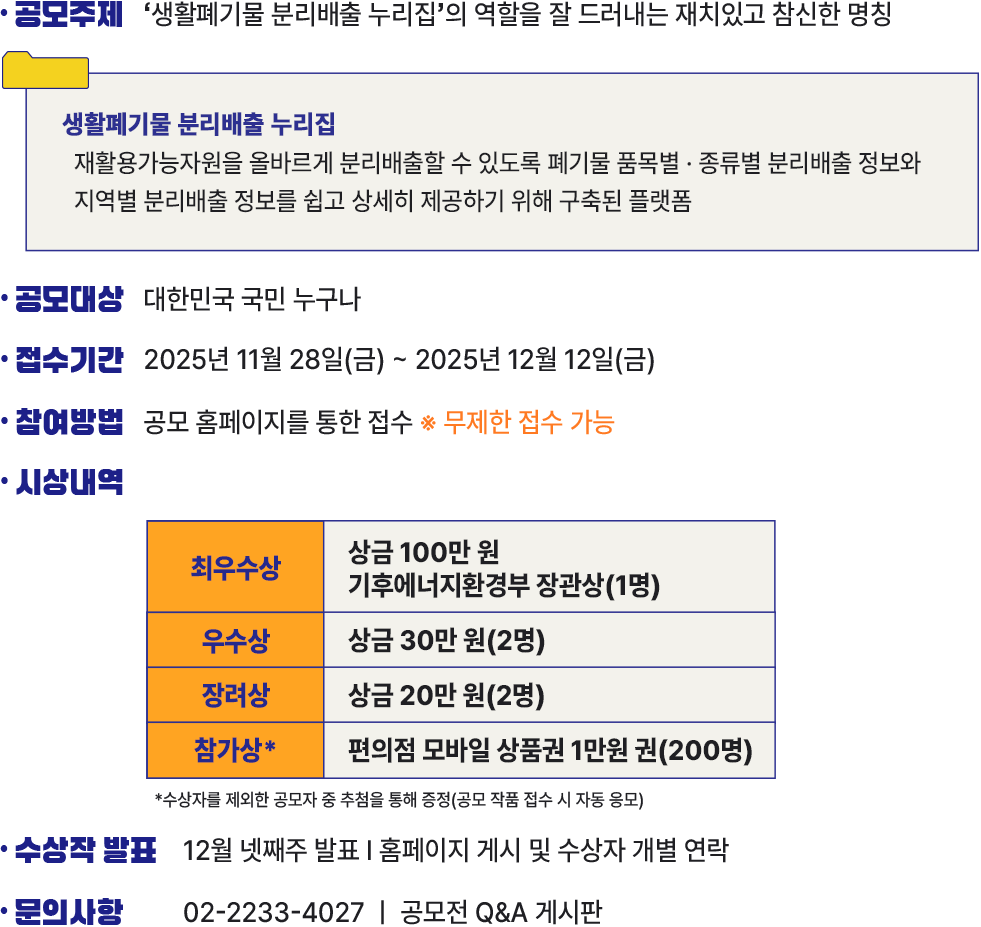 생활폐기물 분리배출 누리집 네이밍 공모전 / 문의 : 02-2233-4027